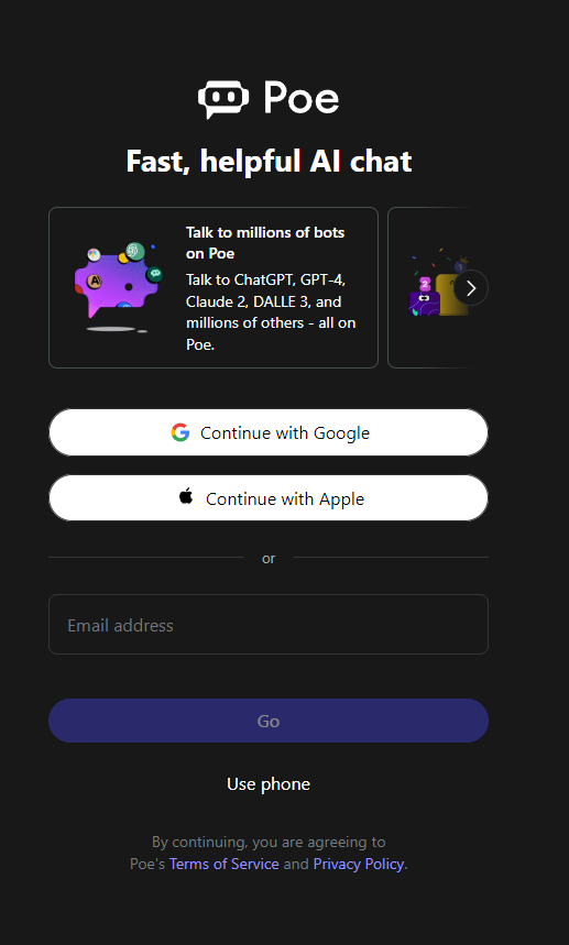 Use Phone: For those who prefer not to link their Poe.com account to Google or Apple, signing up with a phone number is a straightforward alternative. This method may appeal to therapists who wish to keep their professional tools separate from personal accounts.